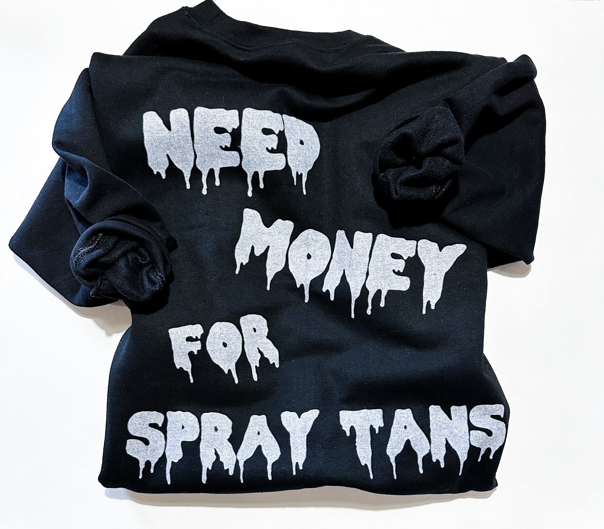Dripping paint “Need Money For Spray Tans” is printed on the back of the sweatshirt. True to size fit but order up a size if you are looking for an oversized look and feel!